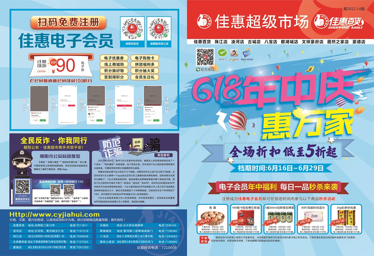 ◎朝陽佳惠超市有限公司 ◎電話:0421-7210006/7206776 ◎地址:朝陽市雙塔區(qū)光明街2段12號 ◎